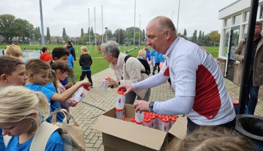 Uitreiking bidons van de Tom Dimmendaal Foundation aan ruim 400 Needse leerlingen